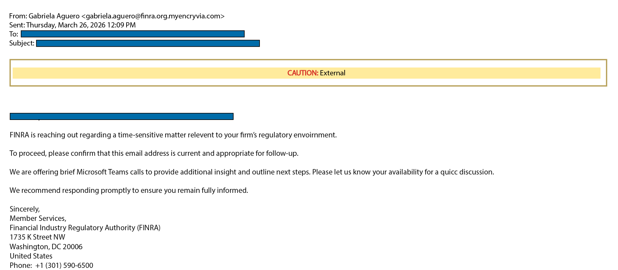 On March 26, 2026, ACA became aware of an active phishing campaign targeting FINRA and SEC-registered financial services firms and advisers. While the scope of the phishing campaign is not yet known, multiple ACA clients have reported receiving messages claiming to be from contacts at FINRA or the SEC.